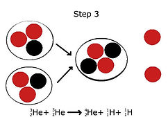 Two light heliums repeat the process once more, eventually fusing to make normal helium, with two protons and
